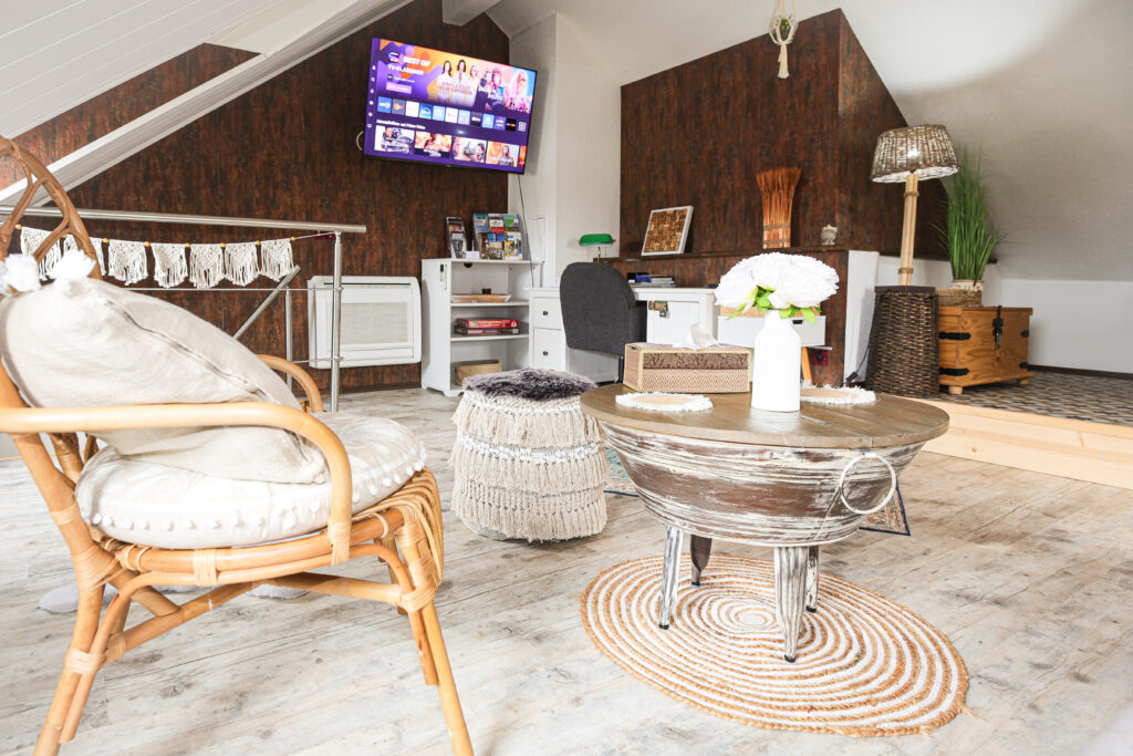 - 55″ Flachbild-TV mit Netflix, Prime, Apple-TV.